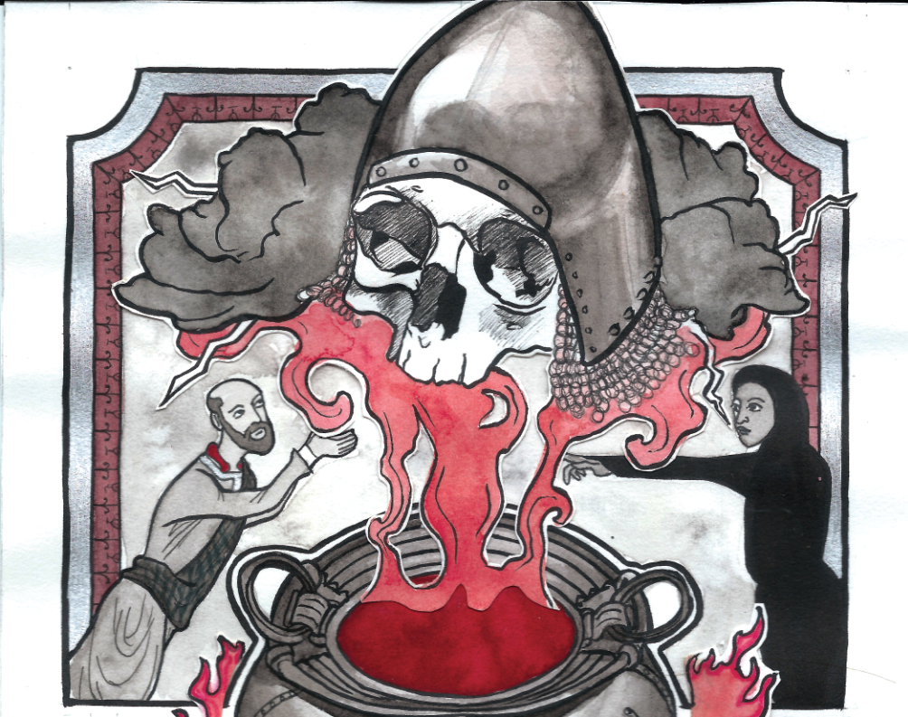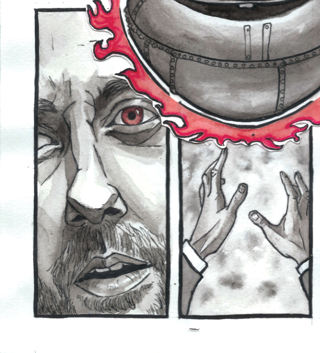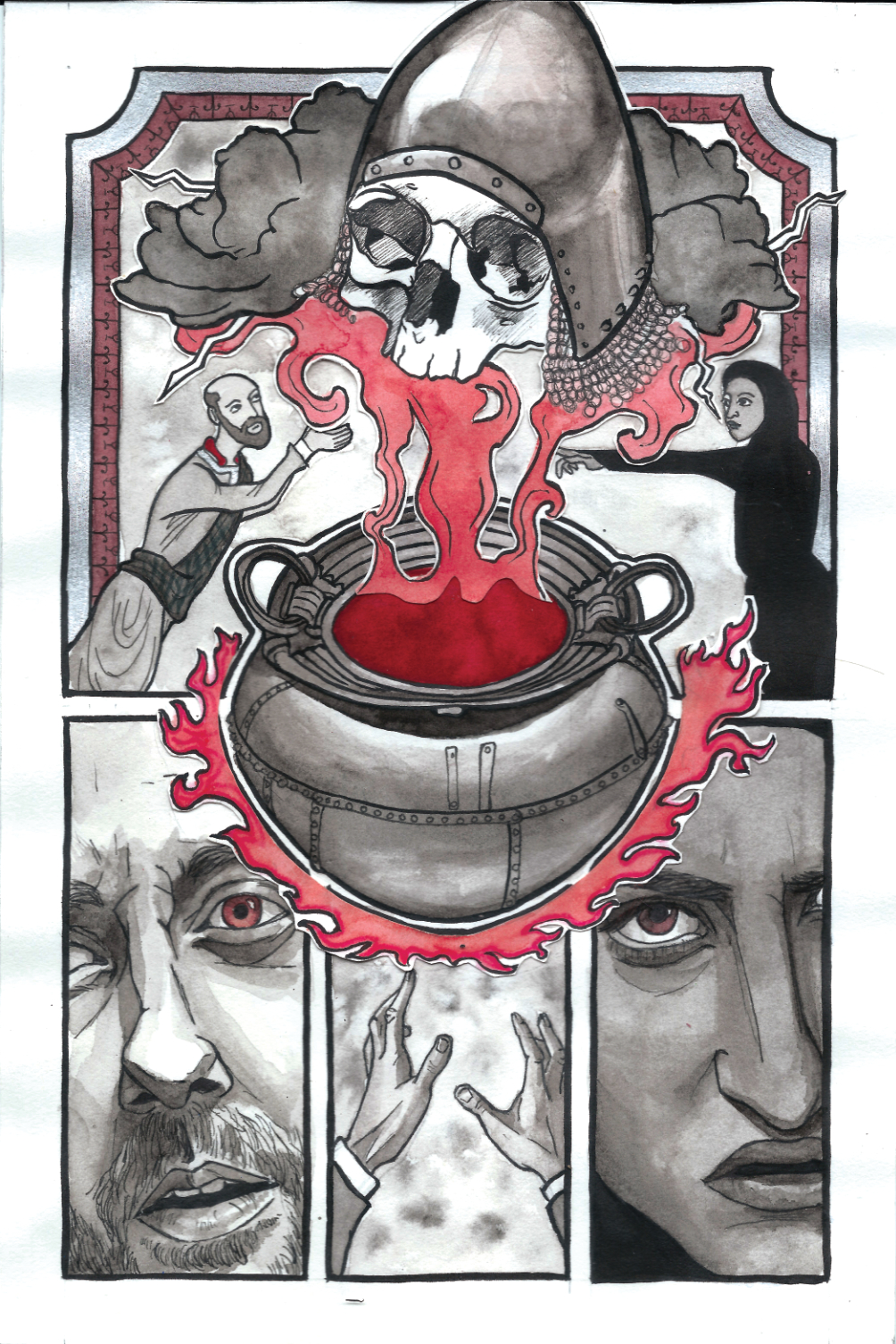 A piece of original page art from my adaptation of Shakespeare's Macbeth. In Act 4 Macbeth has another fateful encounter with The Weird Sister; his last, where his doom is sealed. They conjure three prophecies for him, each with a hidden meaning his misinterprets. Here we see the first one - a skull in armor. He assumes it means victory, which he can almost taste.